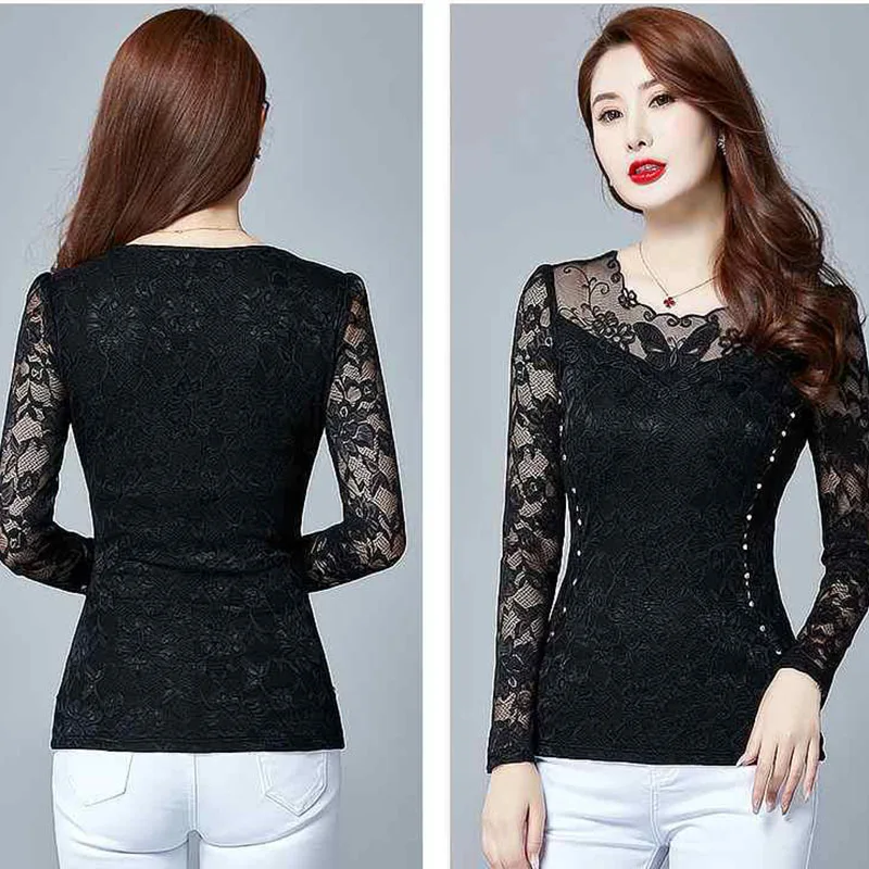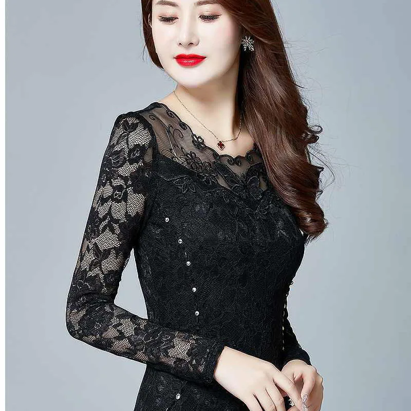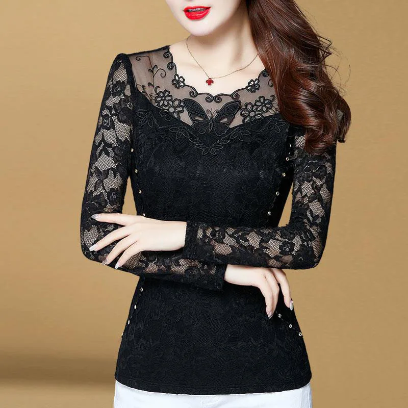 Promo Hollow Out Women Spring Autumn Style Lace Blouses Shirts Casual Long Sleeve Patchwork Spliced Turtl