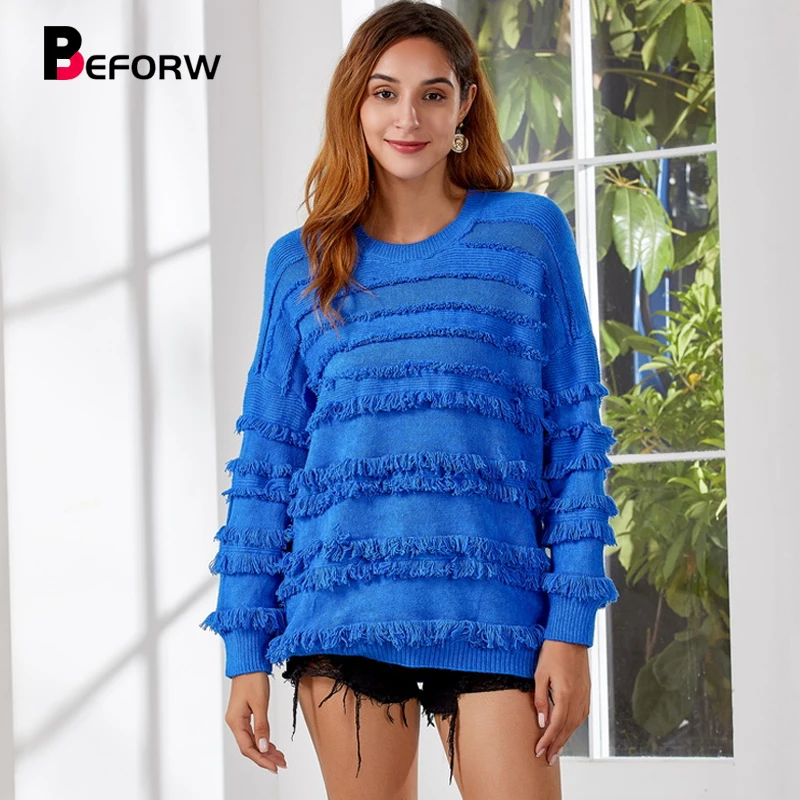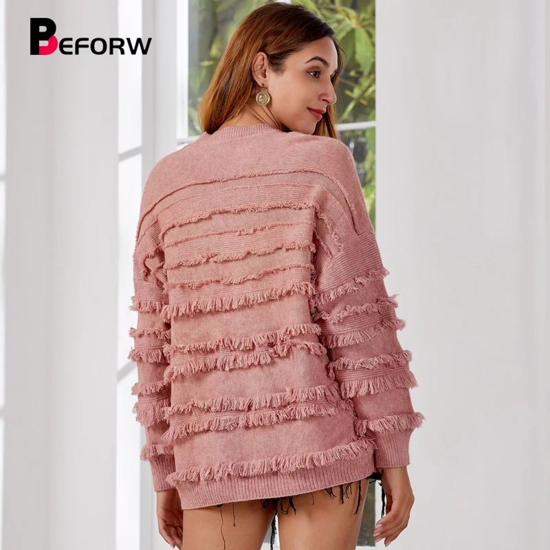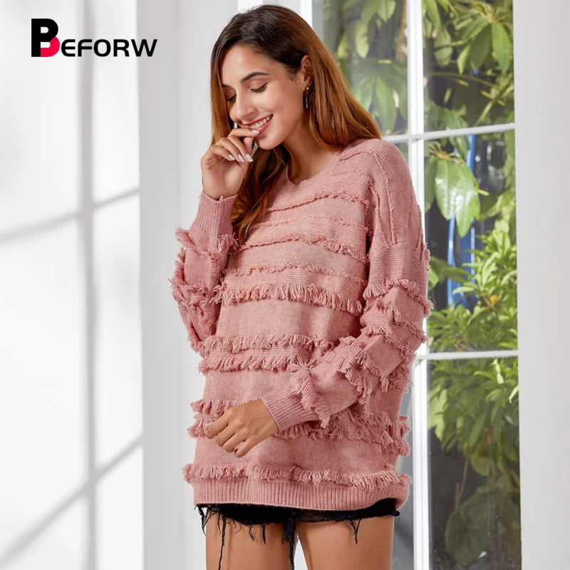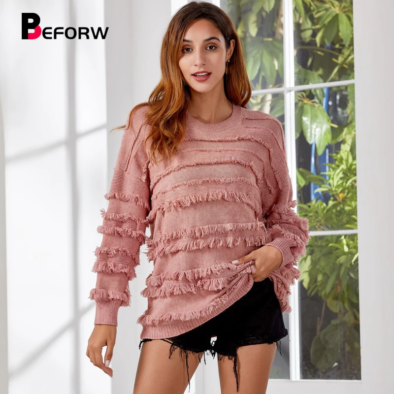 New BEFORW 2019 New Fashion Women O Neck Tassel Pullover Sweater Oversize Fall Long Sleeve knitted Swea